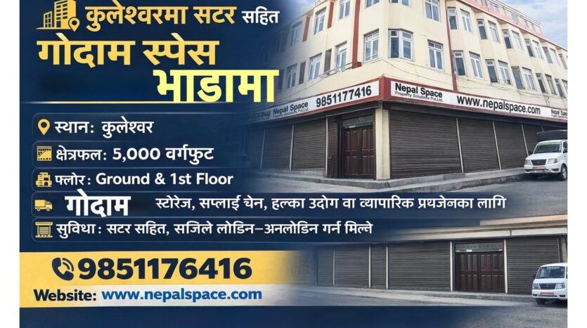 A spacious 2-floor warehouse (godown) with a total area of 5,000 sq.ft. is available for rent in a prime commercial location of Kuleshwor—ideal for storage, distribution, and logistics operations.